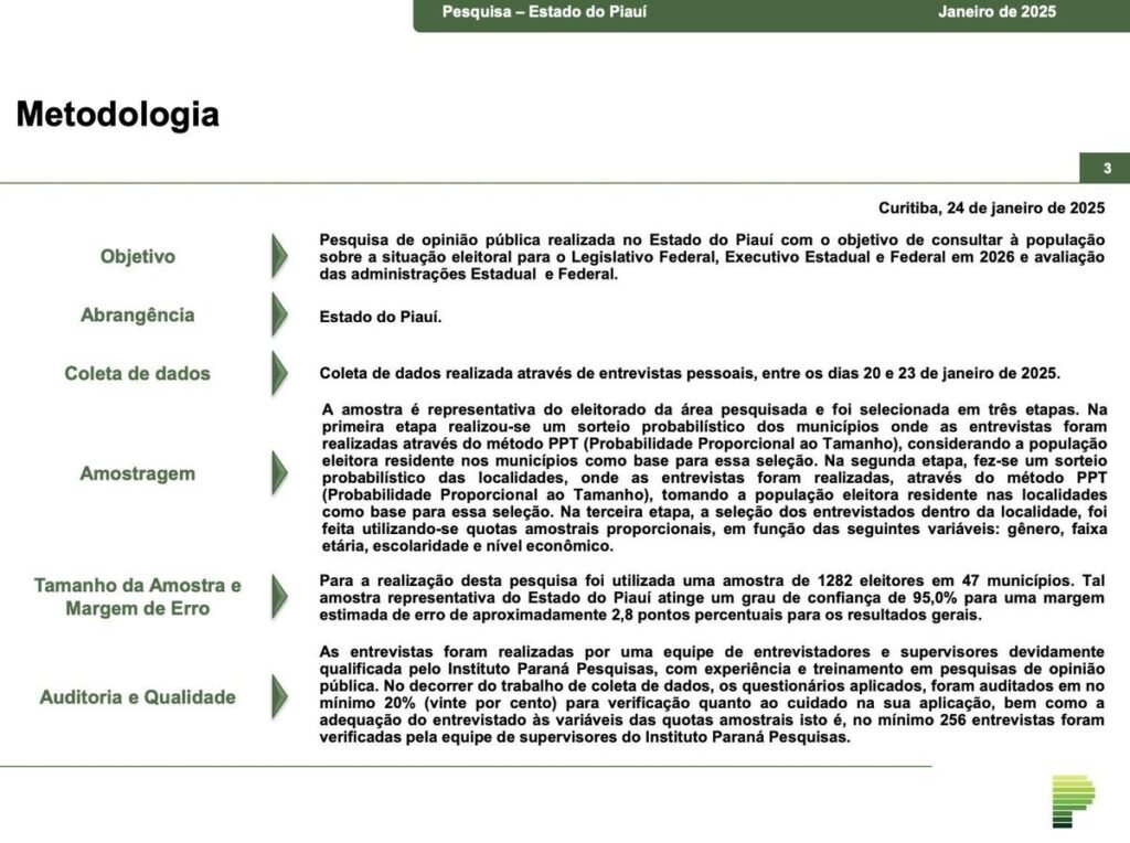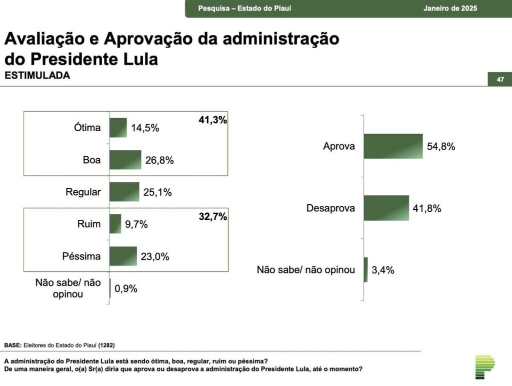 Uma nova pesquisa do Instituto Paraná Pesquisas revela uma queda na aprovação do presidente Luiz Inácio Lula da Silva no Piauí. O levantamento, realizado entre os dias 20 e 23 de janeiro de 2025, ouviu 1.282 eleitores em 47 municípios de todas as regiões do estado.