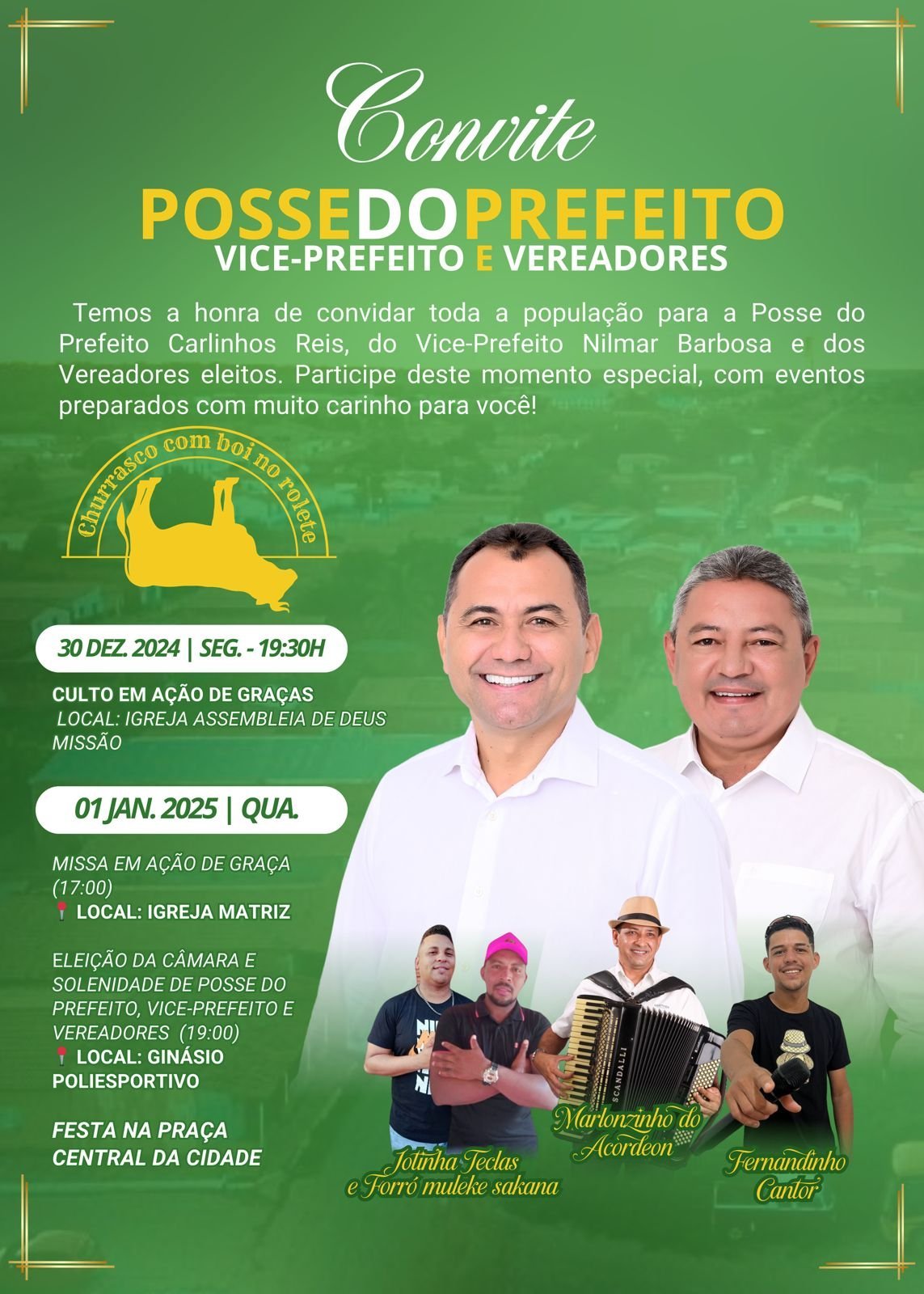 Antes da cerimônia oficial, Carlinhos e seu vice-prefeito, Nilmar Barbosa, participarão de dois eventos religiosos em agradecimento pela nova jornada. No dia 30 de dezembro, às 19h30, haverá um Culto em Ação de Graças na Igreja Assembleia de Deus Missão. Já no dia 1º, às 17h, será celebrada uma Missa em Ação de Graças na Igreja Matriz, antes de seguir para o evento onde tomará oficialmente a posse da prefeitura da cidade.