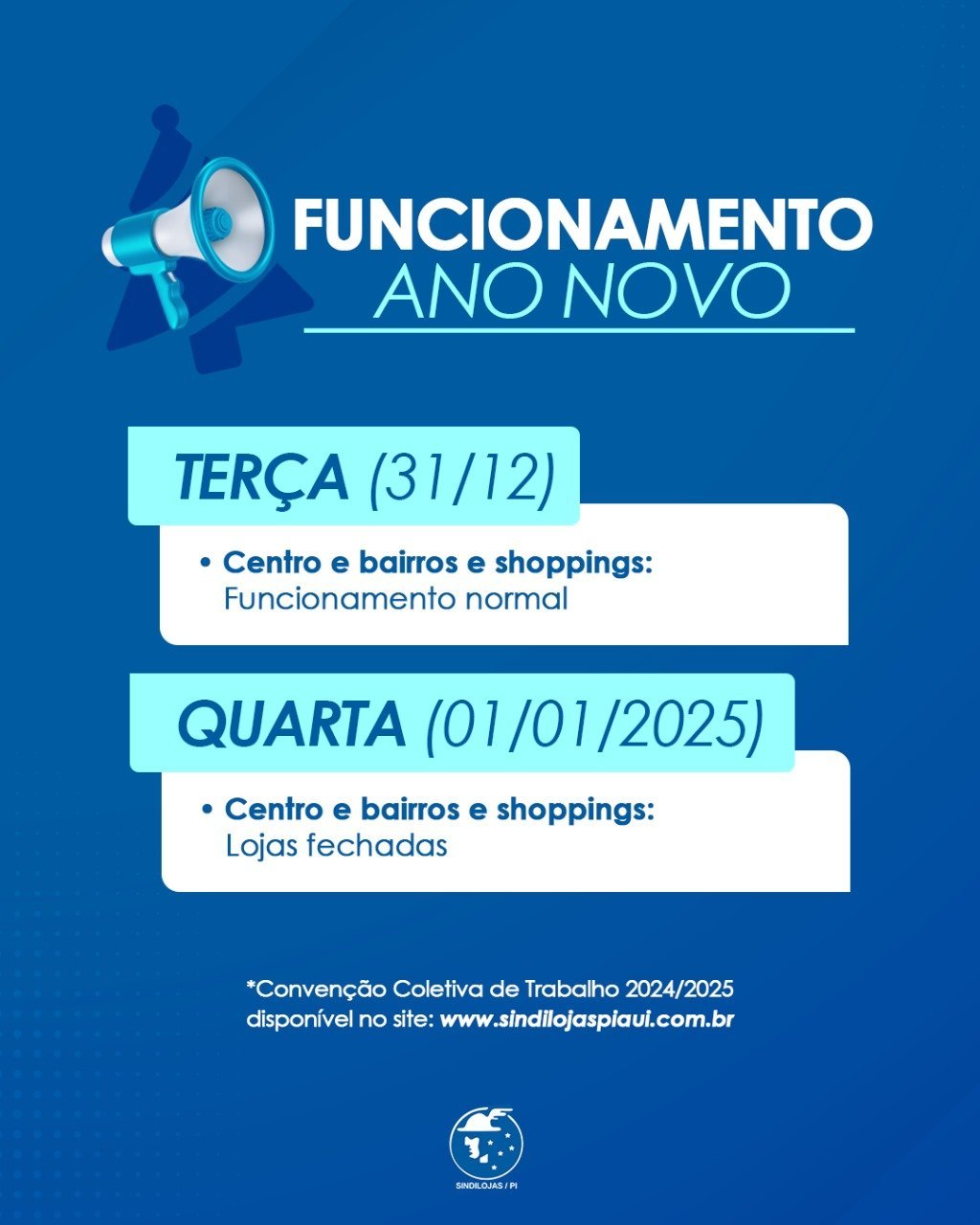 O Sindicato dos Lojistas do Comércio do Estado do Piauí (Sindilojas/PI) informa que as lojas do Centro e dos bairros de Teresina funcionarão normalmente na véspera do Ano Novo (31). Já no dia 01 de Janeiro, as lojas do Centro, bairros e também os estabelecimentos nos shoppings estarão com portas fechadas.