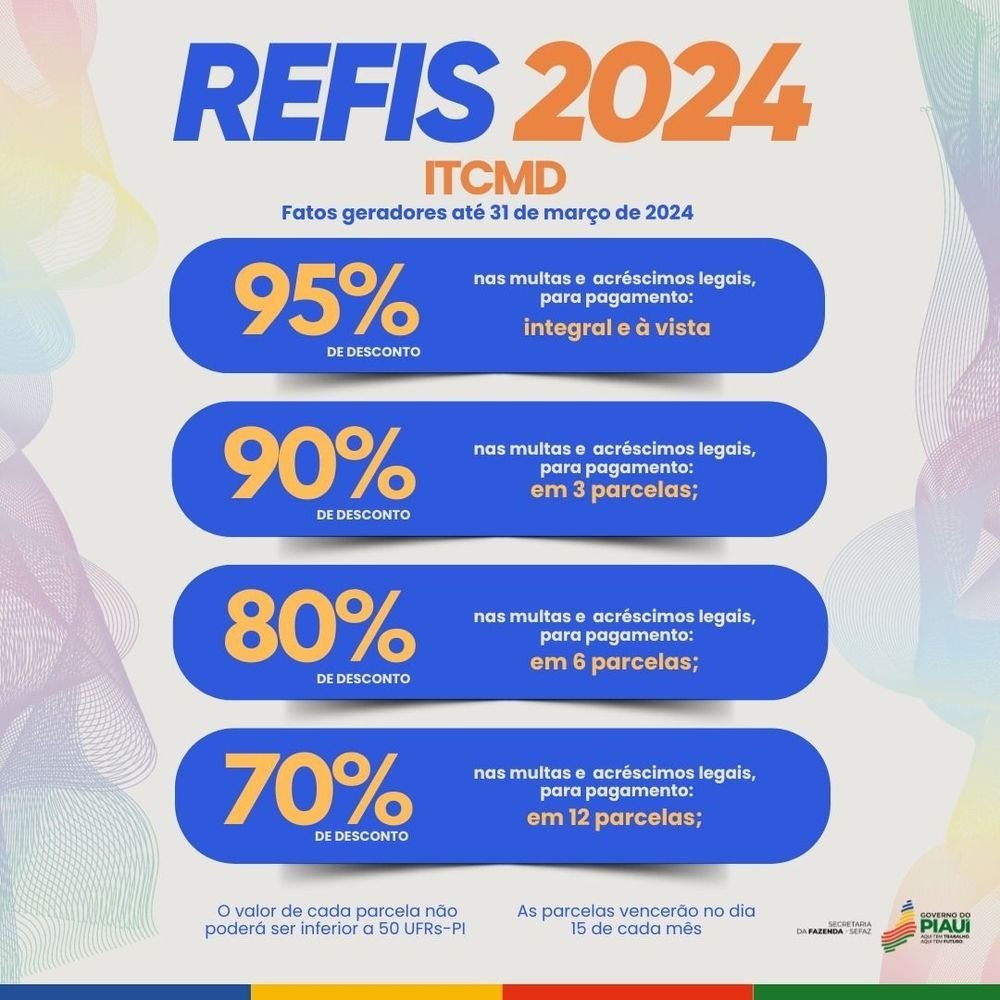 O prazo para adesão ao Programa de Recuperação de Créditos Tributários (Refis) 2024 foi prorrogado para o dia 30 de dezembro. Os pagamentos também devem ser realizados até essa data. Com isso, os contribuintes piauienses que desejam regularizar seus débitos tributários com condições especiais terão mais tempo para resolver suas pendências, aproveitando os benefícios do programa, que oferece descontos de até 95% sobre multas e juros.