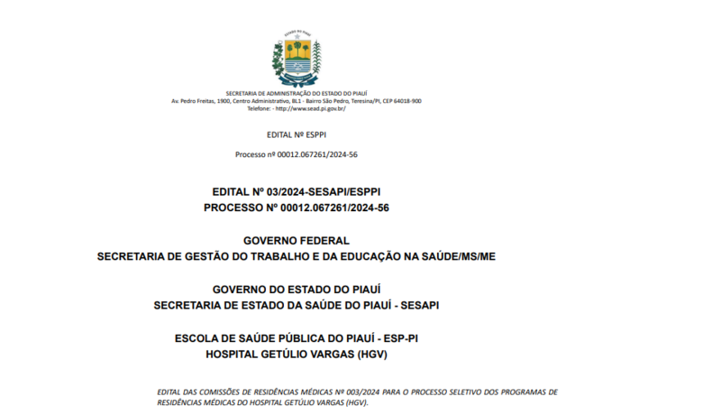 A Secretaria de Estado da Saúde do Piauí (SESAPI), em parceria com a Escola de Saúde Pública do Piauí (ESP-PI) e apoio da Universidade Estadual do Piauí (UESPI), lançou ontem segunda-feira (23) o edital nº 003/2024 para o processo seletivo dos Programas de Residência Médica no Hospital Getúlio Vargas (HGV). O edital pode ser acessado na aba de Notas e Avisos importantes do site da Sesapi.